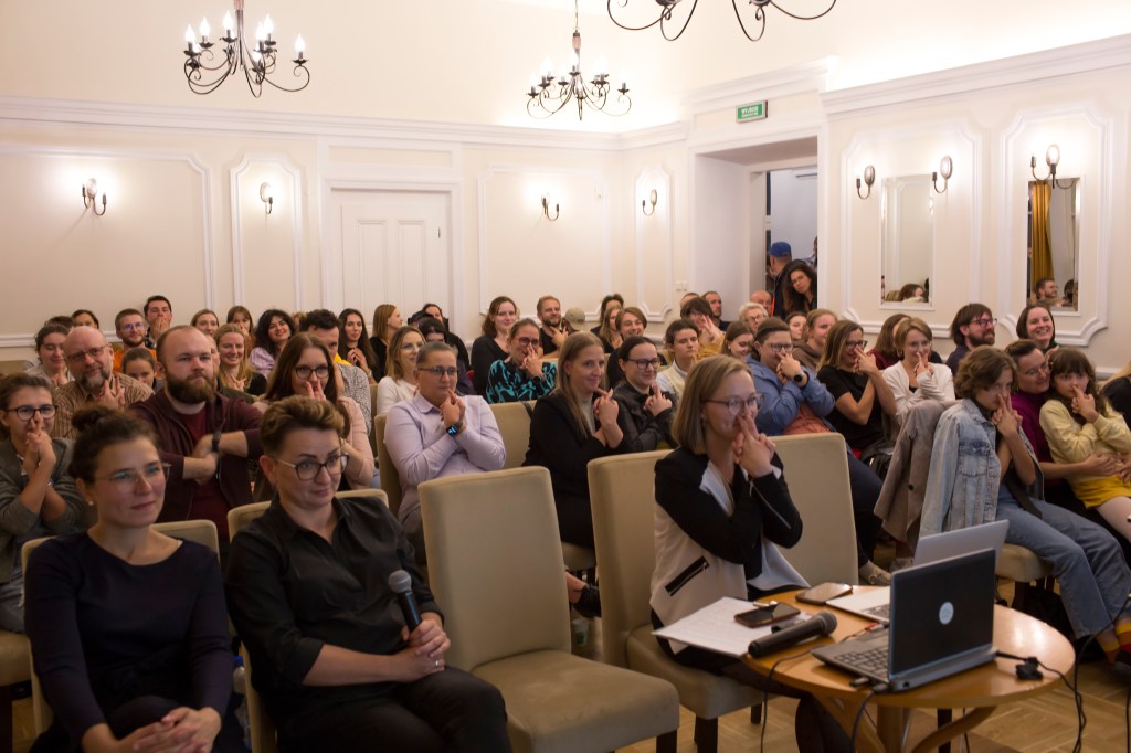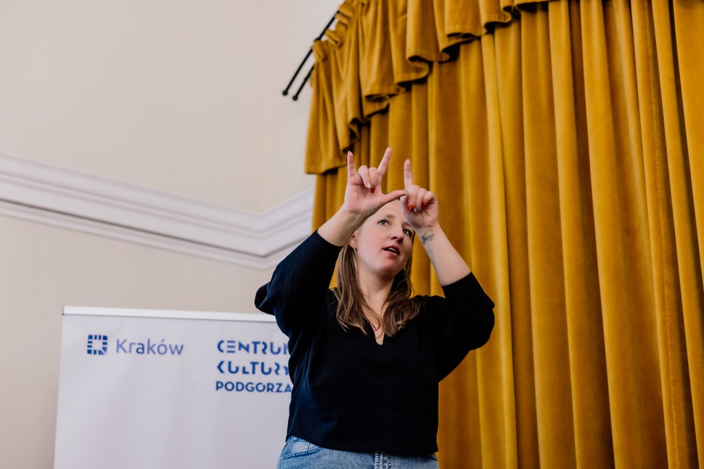 Poza poezją autorki, deklamowaną i tłumaczoną na polski język migowy przez artystki ze społeczności Głuchych, pojawiła się również autorska poezja migowa oraz warsztat jej tworzenia, a także wyjątkowy pokaz pantomimicznej formy Visual Vernacular.
